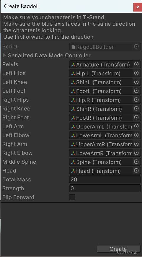 然后这里的模型是帮助查看导入的人物模型对应部位的,新建一个ragdoll后,拖曳的要是层级面板中的部位。