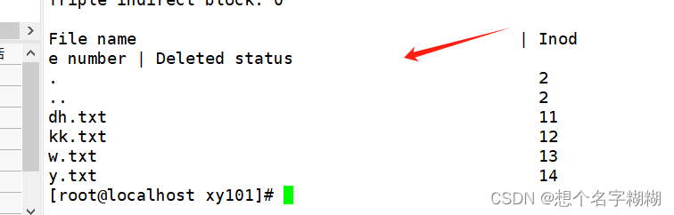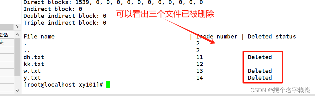 - [root@localhost xy101]# rm -f dh.txt w.txt y.txt //模拟误删dh.txt w.txt y.txt,这三个文件