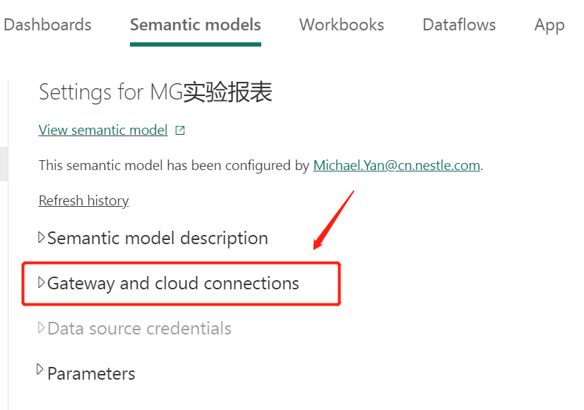 在Power BI云服务中,为数据源创建一个“云连接”,这个连接会通过网关与本地数据源通信。
