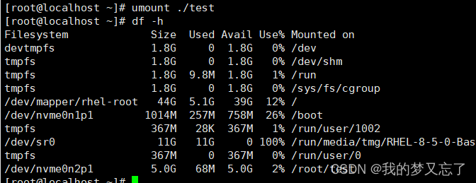 取消挂载,可以看见它显示的是挂载在/dev/nvme0n2p1上的(umount ./test或者umount /dev/nvme0n2p5)