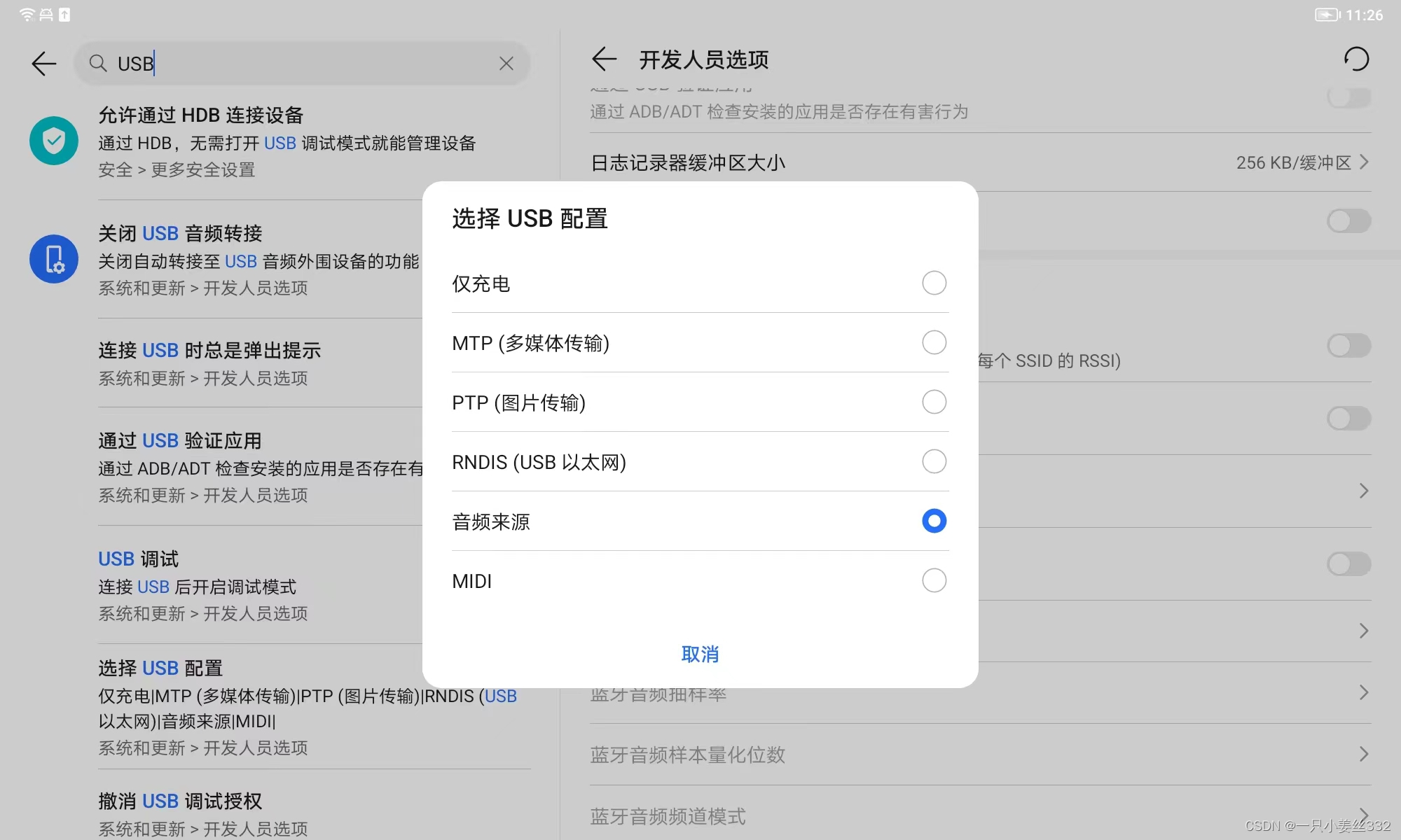 2.选择USB配置,选择音频来源