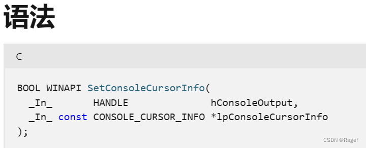 这里需要传两个参数,第一个还是我们前面说到的句柄,第二个则就是指针类型的 CONSOLE_CURSOR_INFO,也就是PCONSOLE_CURSOR_INFO