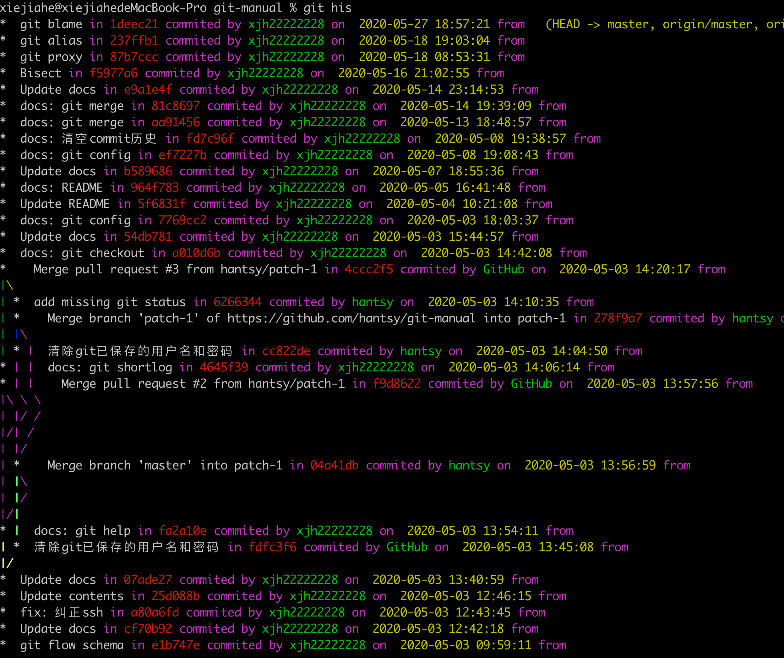 - git config --global alias.his "log --graph --decorate --oneline --pretty=format:'%Creset %s %C(magenta)in %Cred%h %C(magenta)commited by %Cgreen%cn %C(magenta)on %C(yellow) %cd %C(magenta)from %Creset %C(yellow)%d' --abbrev-commit --date=format:'%Y-%m-%d %H:%M:%S'"