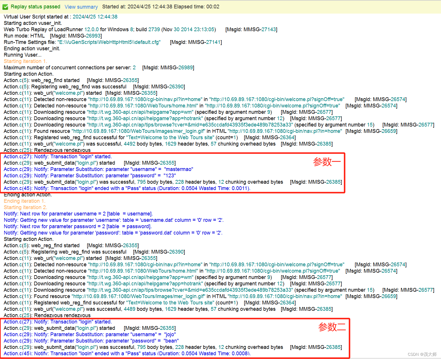 - 使用 lr_output_message() 函数输出的日志信息,只有在 LoadRunner 的执行窗口中可见,并不会被写入到性能测试的最终报告中。