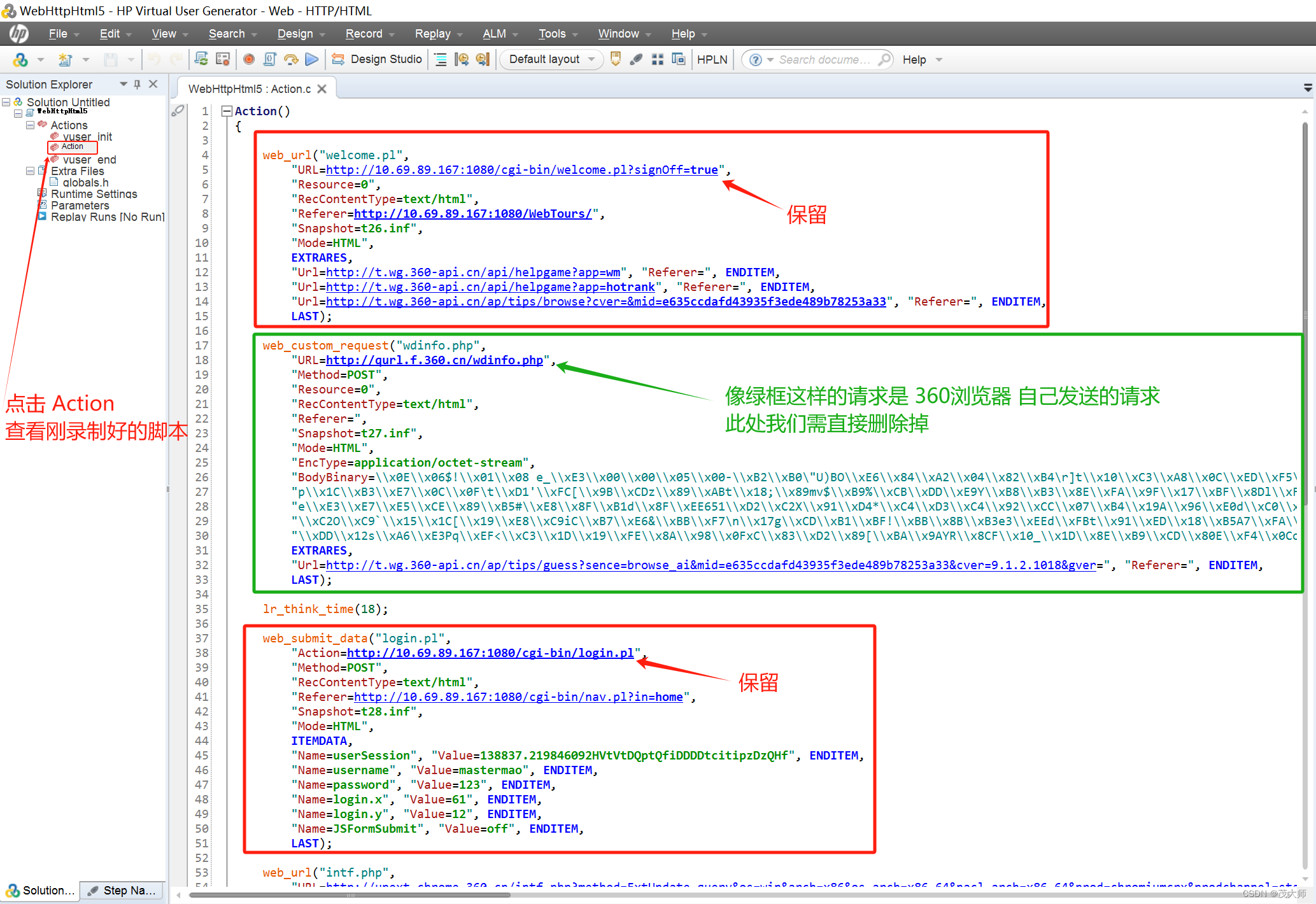 - 因为录制好的脚本有许多无关我们系统的一些代码,这些代码需要删除