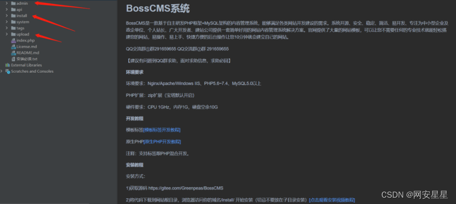 打开cms目录后我们先去简单阅读一下BOSScms的README.md,看看设计者的对于自己的介绍,搜 集点信息看看注意事项,作者也是很nice都录制了视频。