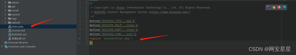 我们直接进入根目录下的index.php,看看会有什么发现,这里定义了四个常量和一个利用文件包含 system目录下的enter文件,我们跟进去看看enter文件。