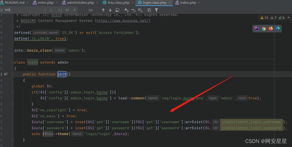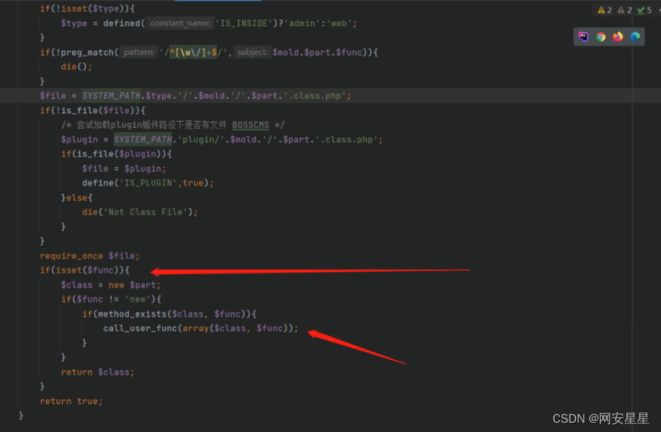 这里该load_class()方法需要四个参数,我们先来进去第一个if逻辑判断一下$type类型因为初始赋值 为null,直接进入判断if逻辑,这里涉及前后台功能调用,如果是IS_INSIDE是true进入system/admin目录功能,如果是fales进入system/web目录功能。