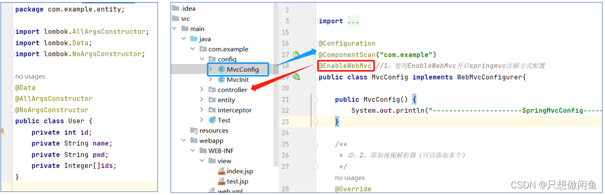 ② 配置MVC:在config包中创建一个名为MvcConfig的类; @EnableWebMvc 是一个Spring框架的注解,用于在基于Java的Spring应用程序中启用Spring MVC(Model-View-Controller)配置。通常将它应用于带有@Configuration注解的配置类上。