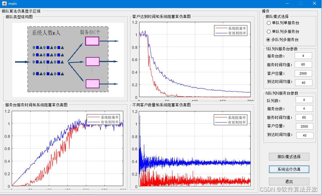 排队算法的matlab仿真,带GUI界面。分别仿真单队列单服务台,单队列多服务台以及多队列多服务台三种排队方式。
