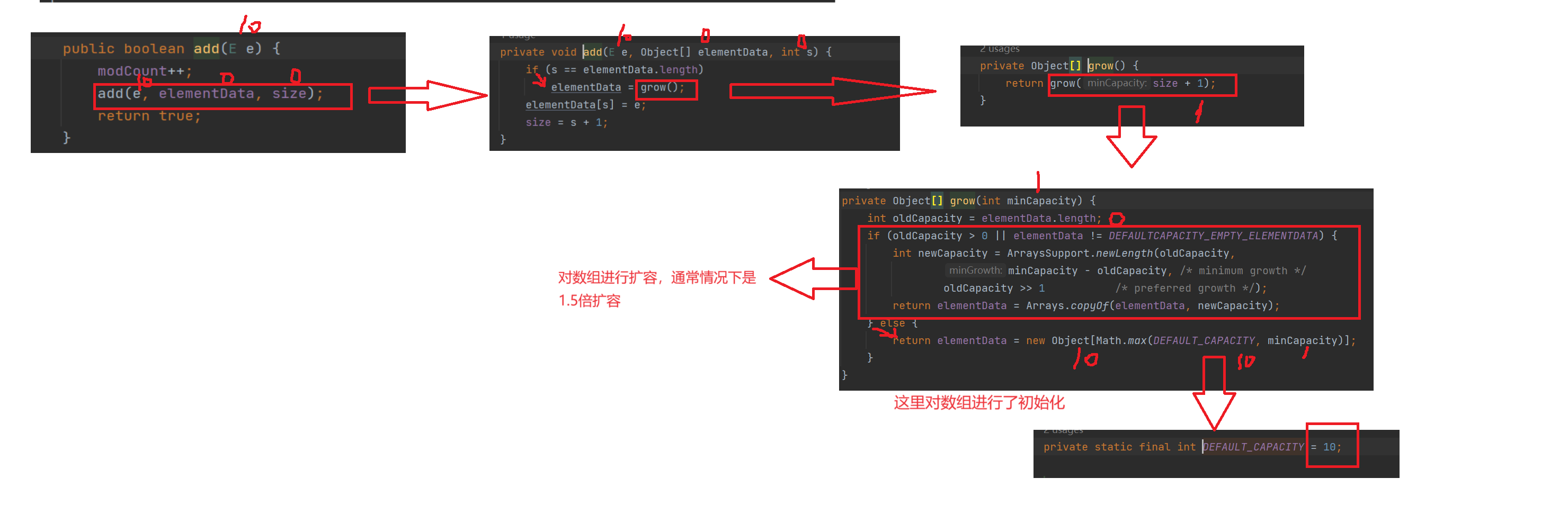 我们可以通过add的底层代码逻辑,得出在数组长度为0时,会将数组的长度初始化为10,如果数组满了,也会进行1.5倍的扩容。