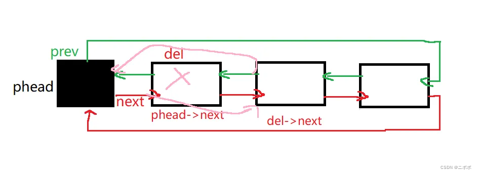 - phead->prev = del->prev;//头结点的前一个节点指向del->prev