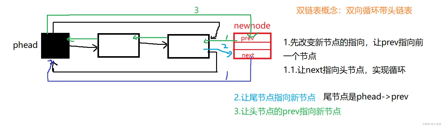 - newnode->prev = phead->prev;//phead->prev 是头节点指向的上一个节点也就是尾节点
