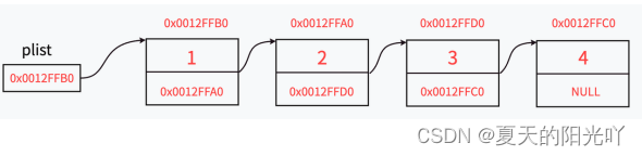 图中指针变量plist保存的是第一个节点的地址,我们称plist此时"指向"第一个节点,如果我们希望plist"指向"第二个节点时,只需要修改plist保存的内容为0x0012FFA0。