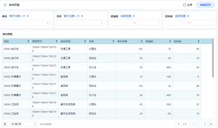 库存预警对各个仓库的商品进行超储量、短缺量进行计算,便于随时掌握查看各个商品的库存情况。