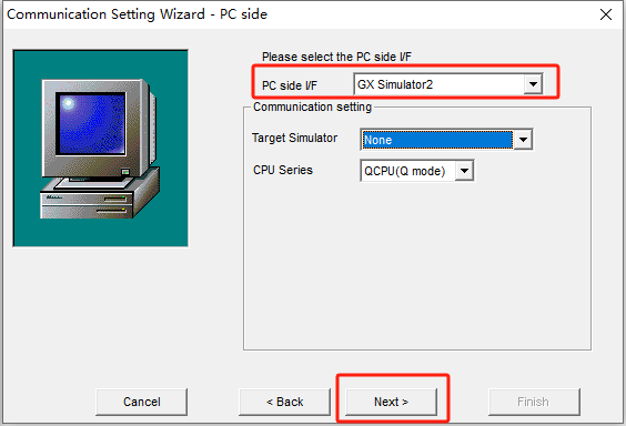 (3)由于本案例采用的是GX Works2仿真方案,选择GX Simulator2,选择CPU型号,下一步即可;