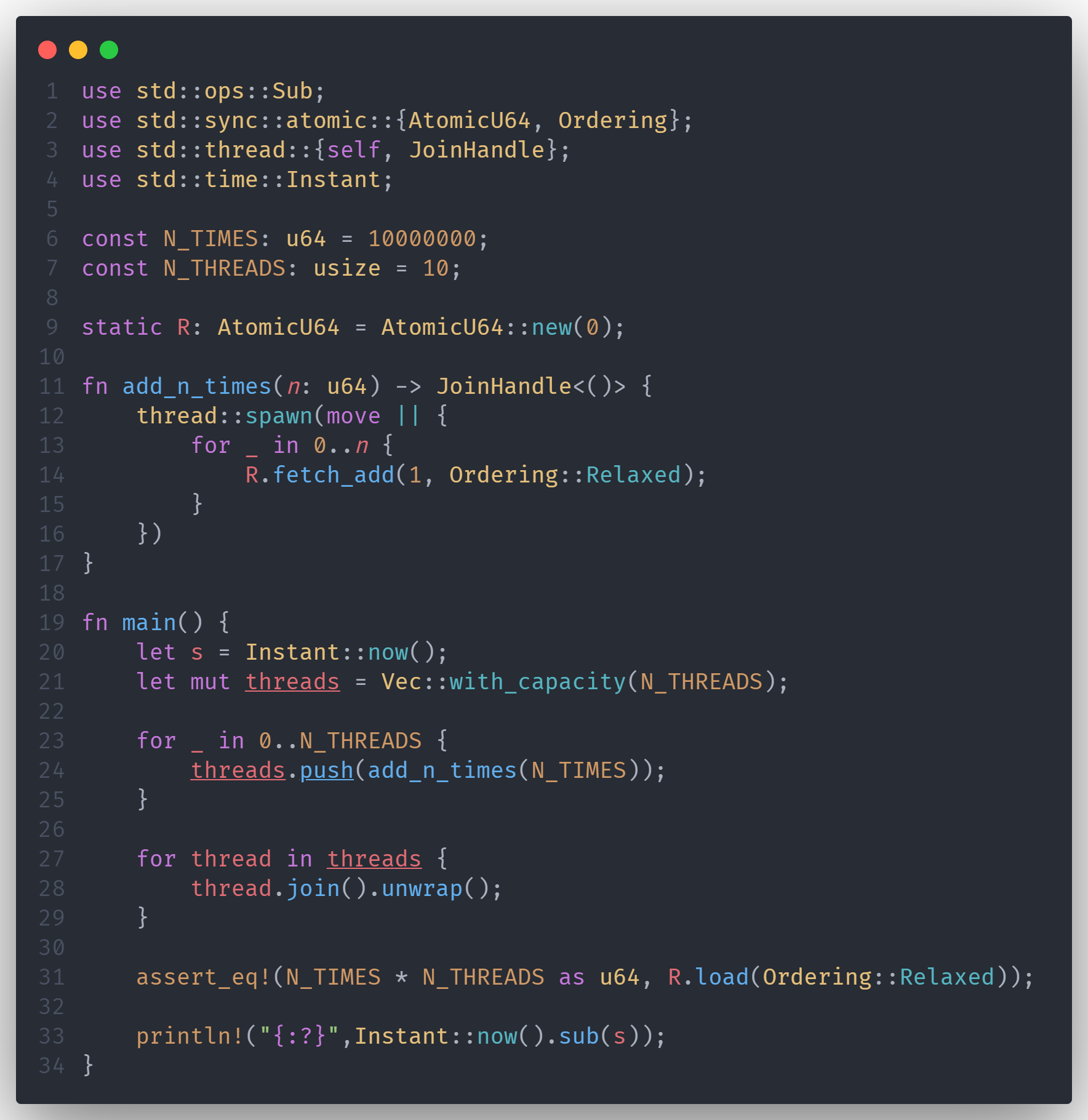 像 AtomicU64 这样的原子类型也可以使用像 fetch_add() 这样的原子操作从多个线程安全地访问。例如:
