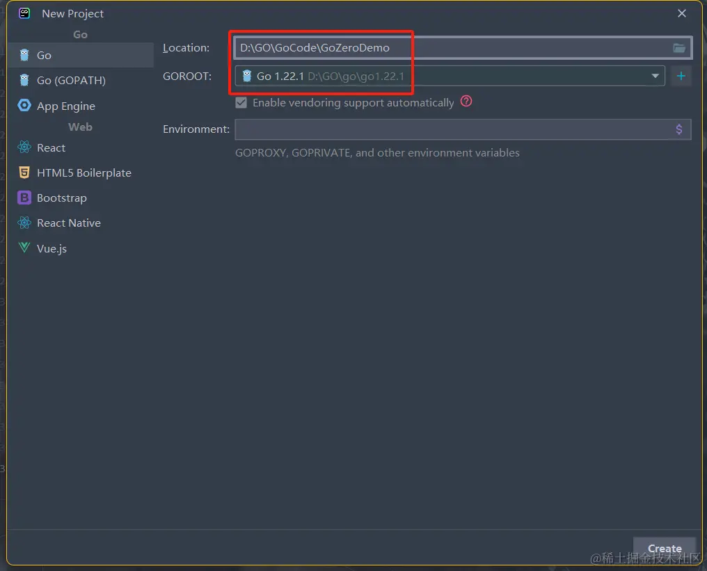 选择新建项目的文件夹以及命名,选择Go的版本(我使用的是Go 1.22.1)