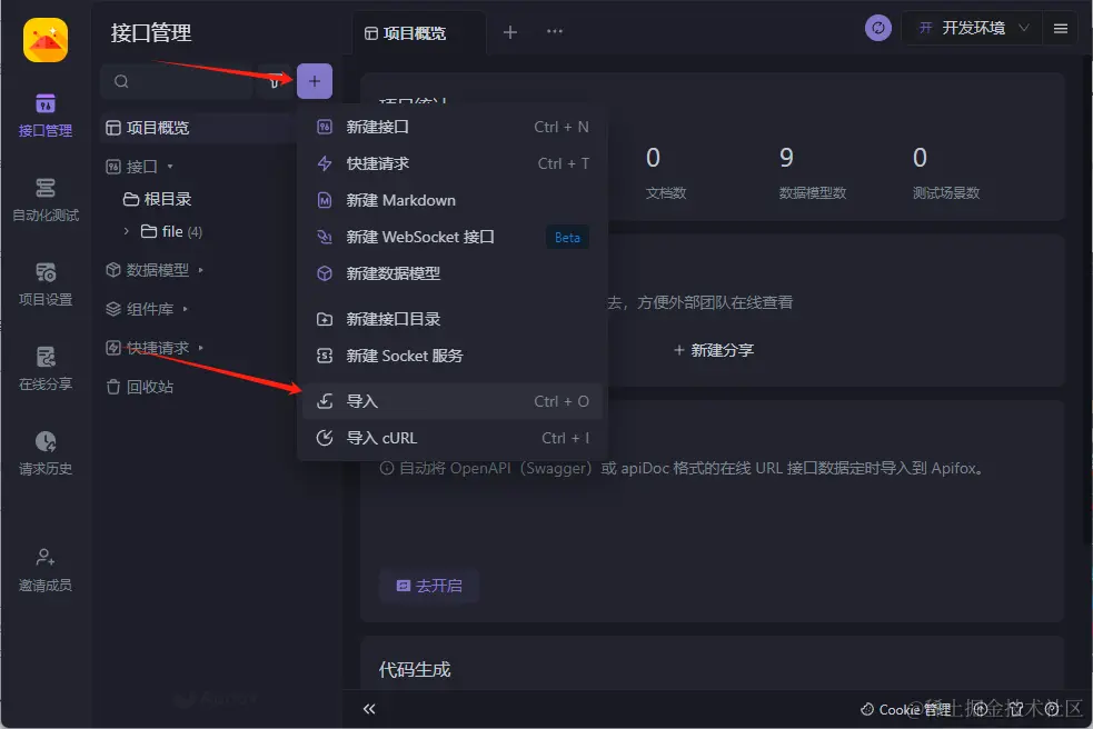打开Apifox, 新建接口项目, 点击这里导入json文件