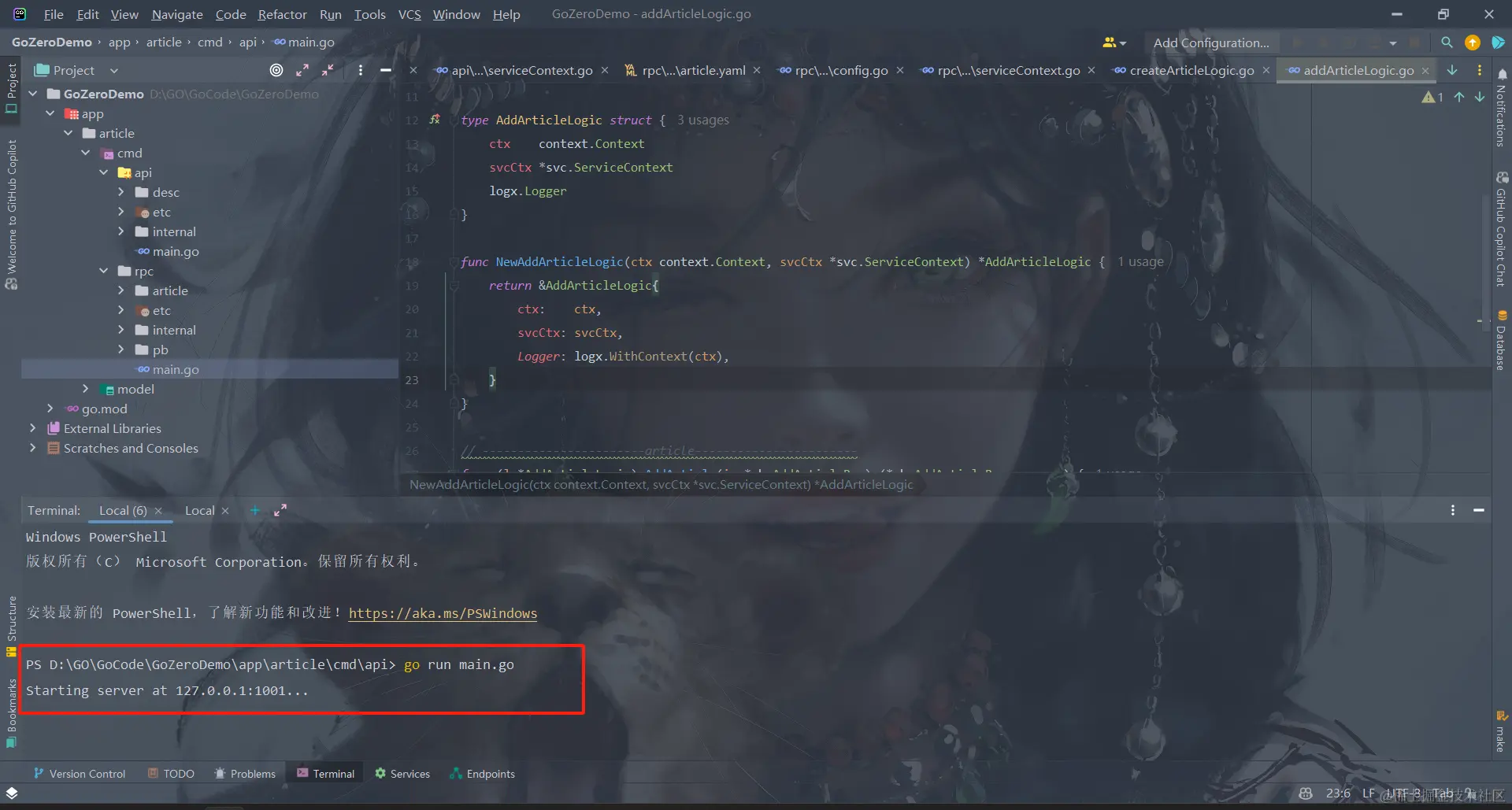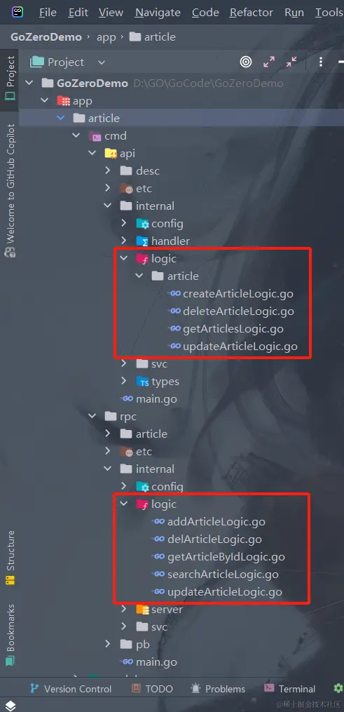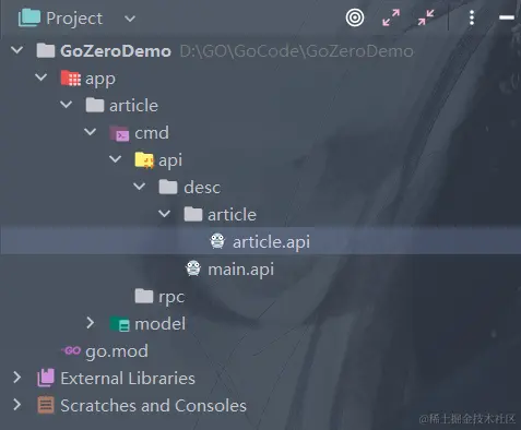 会自动生成etc、internal文件夹以及article.go文件(我习惯把article.go文件改成main.go文件:如果我们后续有多个微服务,执行goctl命令的时候就不用频繁切换文件名称了)