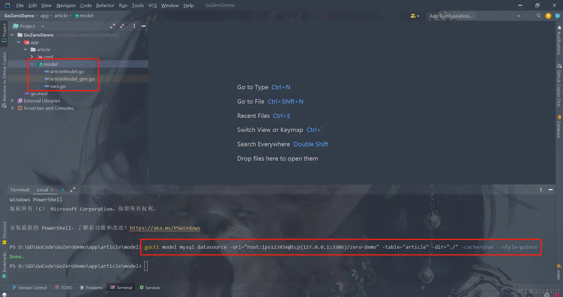 使用goctl命令生成model(username、passwd、host、port、dbname、tables换成自己的对应的数据)
