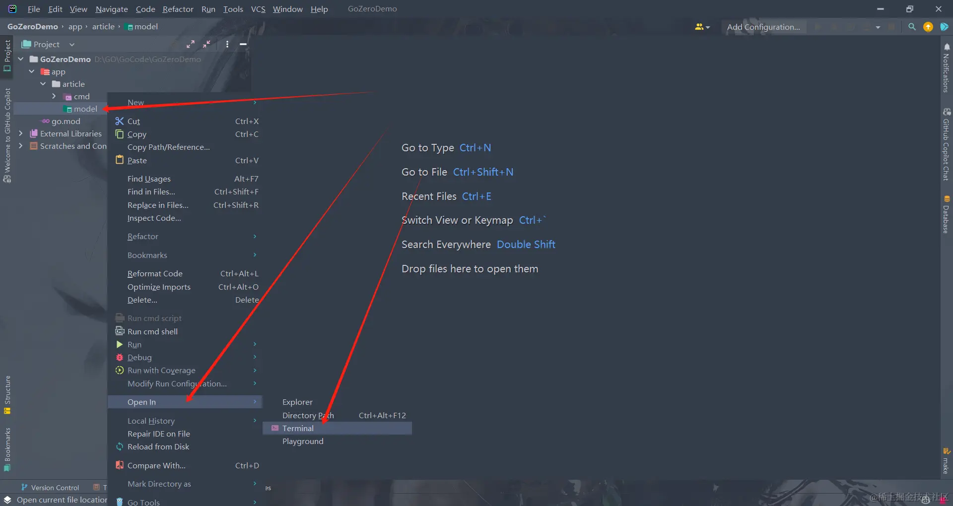 快速定位到model目录下执行该命令(右键model-->找到Open In-->点击Terminal)