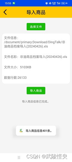鉴于此,我决定为这个应用开发一个导入商品信息的功能。该功能要达到的目标是,在商品更新后,由与我对接的同事按我要求的模板将商品信息做成一个xls文件,然后通过通信软件(如钉钉、微信)将这个xls文件发送给其他的同事。其他同事在手机上下载这个xls文件,然后进入本应用的导入商品模块,选择这个xls文件,将文件内的数据导入的应用内数据库文件中。这样的好处是,以后的商品更新操作都可以由同事们自己完成,不用我插手了。我按这个思路在网上搜索了相关的知识,我希望使用第三方的poi库读取xls文件的数据内容(因为之前开发的将db文件中将数据导出为xls文件就是用的poi库),然后将获取到的数据更新到应用的私有空间内。网上这方面的内容还是比较容易找到,将搜索到的几篇文章中的知识点了解清楚后,依瓢画葫芦就完成了这个功能。通过真机调试,实现了从选定的数据功能。