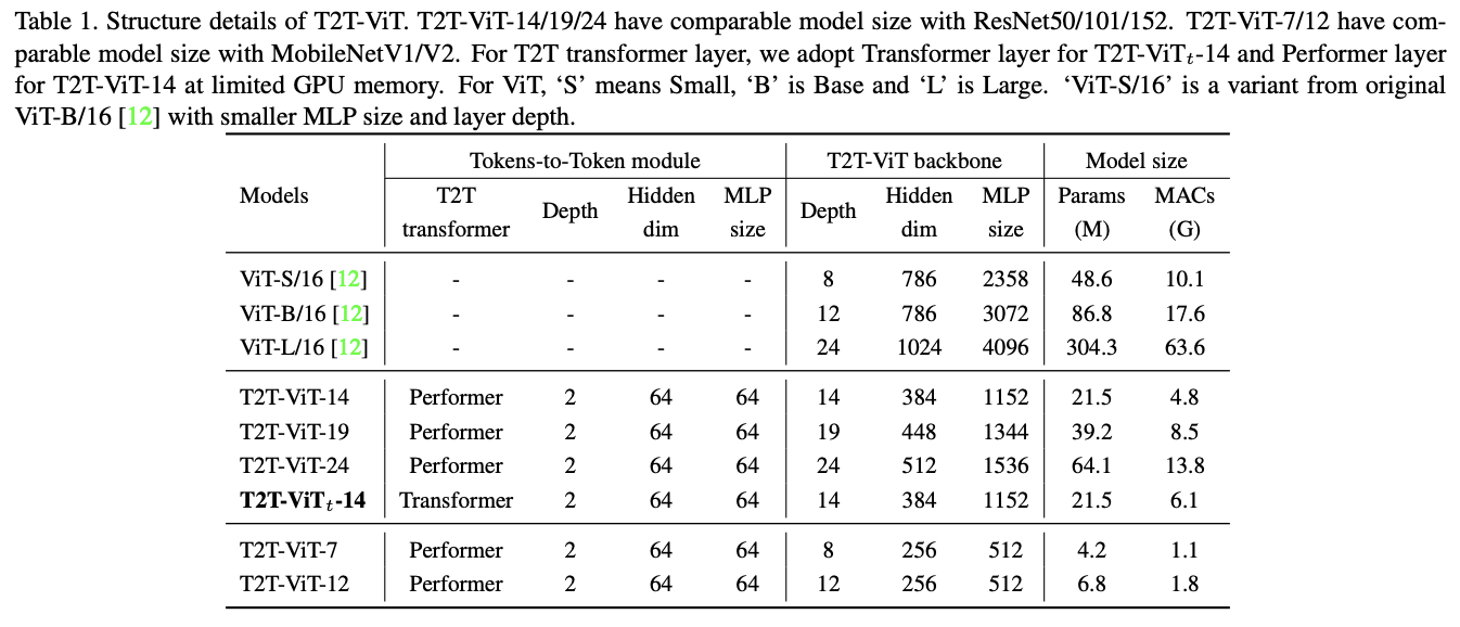 此外,由于T2T模块中的token长度大于ViT中的一般设置(16 × 16),MAC和内存使用量都很大。为了解决这个问题,将T2T层的通道维度设置为较小的值(32或64)来减少 MAC,也可以采用高效的Transformer层变种,例如 Performer层,从而在有限的GPU内存下减少内存使用。