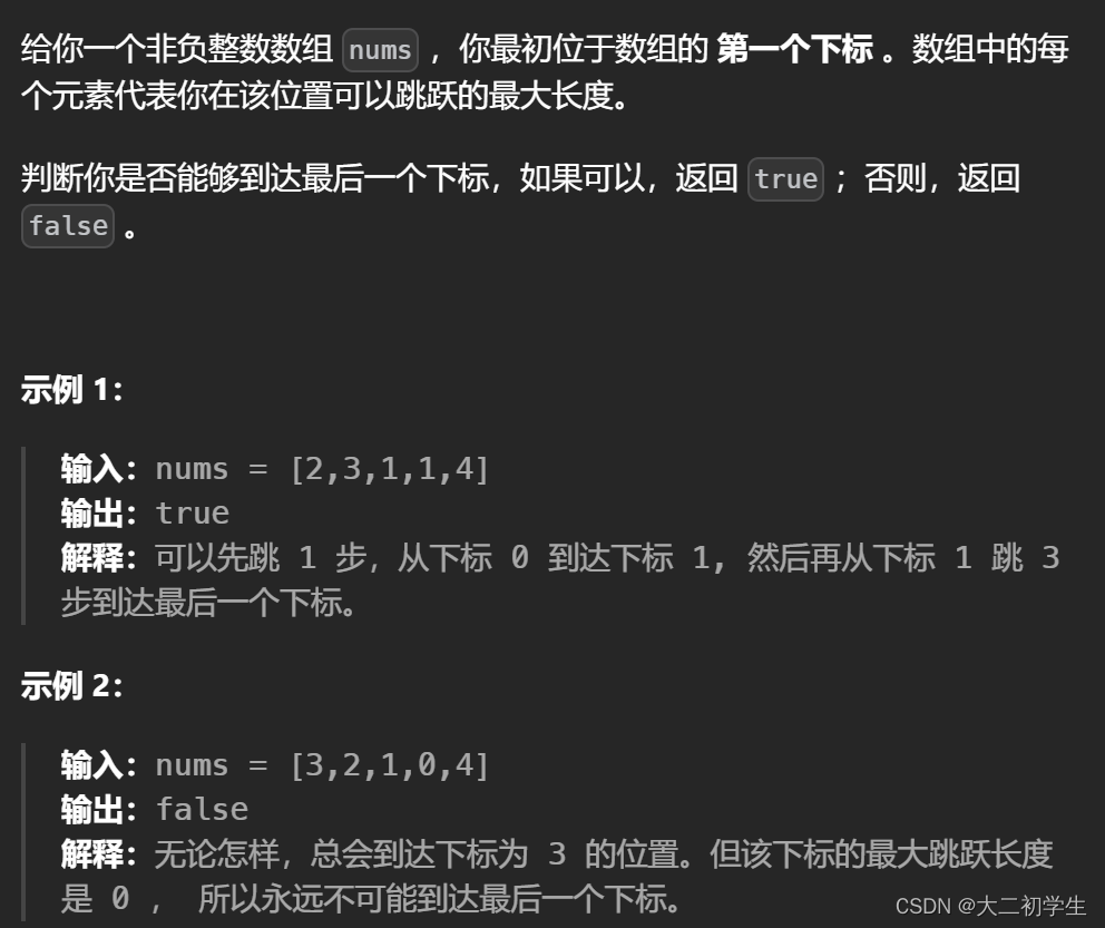 每次纠结跳几个就会变得很复杂,如果看覆盖范围就很方便。注意i <= cover意味着在覆盖范围内是可以随意跳跃的,i + nums[i]是当前遍历到的数可覆盖的最大下标,如果超越了终点nums.size()即返回true。