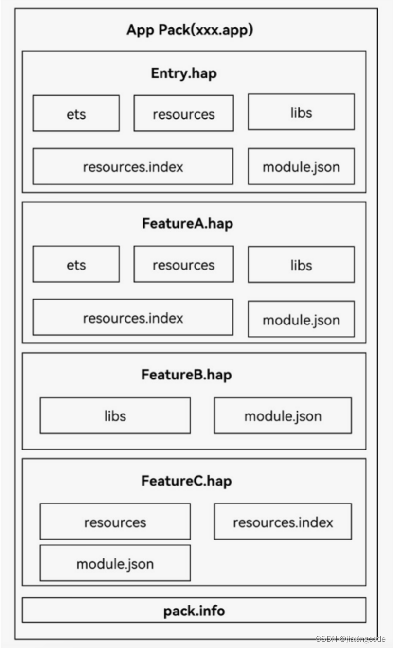每个HarmonyOS应用可以包含多个.hap文件,一个应用中的.hap文件合在一起称为一个Bundle,而bundleName就是应用的唯一标识,在应用上架到应用市场时,需要把应用包含的所有.hap文件(即Bundle)打包为一个.app后缀的文件用于上架,这个.app文件称为App Pack(Application Package),其中同时包含了描述App Pack属性的pack.info文件;在云端(服务器)分发和终端设备安装时,都是以HAP为单位进行分发和安装的。打包后的HAP包结构包括ets、libs、resources等文件夹和resources.index、module.json、pack.info等文件。