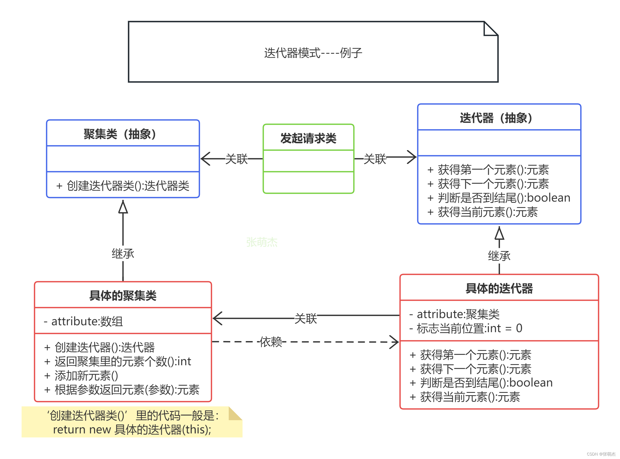 - 迭代器:迭代器的抽象类或接口 + 具体的迭代器