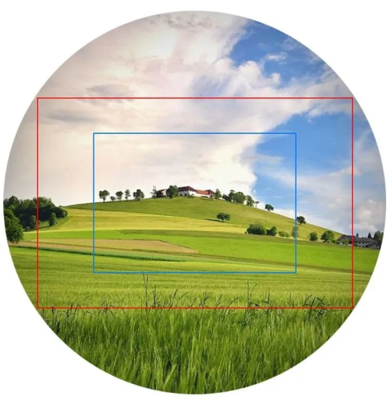 如上图,假设在某一个镜头,其成像面会出现图上圆形的视野,假设红色框为全画幅CMOS,蓝色框为半画幅,可见相同镜头下,即相同焦距下,由于画幅的不同最终导致的视野也不同,而历史原因导致人们更加习惯了用焦距来评估相机的视角,因此为了统一不同画幅下焦距对视角的影响,人们引入了等效焦距.