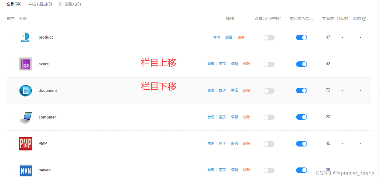 当我们的栏目很多的时候,通过【置顶】来排列顺序是很麻烦的,应该加一列,设置优先级别。太难用了