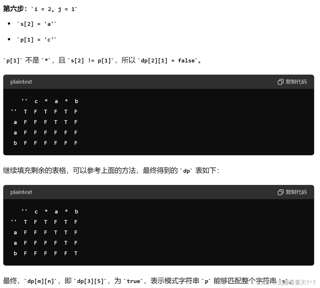 2、③可以总结为:当 dp[i][j-2] 为真或者 (p[j-1] == '.' || p[j-1] == s[i])一个为真且 dp[i-1][j] 为真,则dp[i][j]为真(整合后p[j]==*时引发的所有结论,可以发现这些结论的本质就是围绕p[j-1]*的组合是空串还是非空串进行研究并得出结论的)