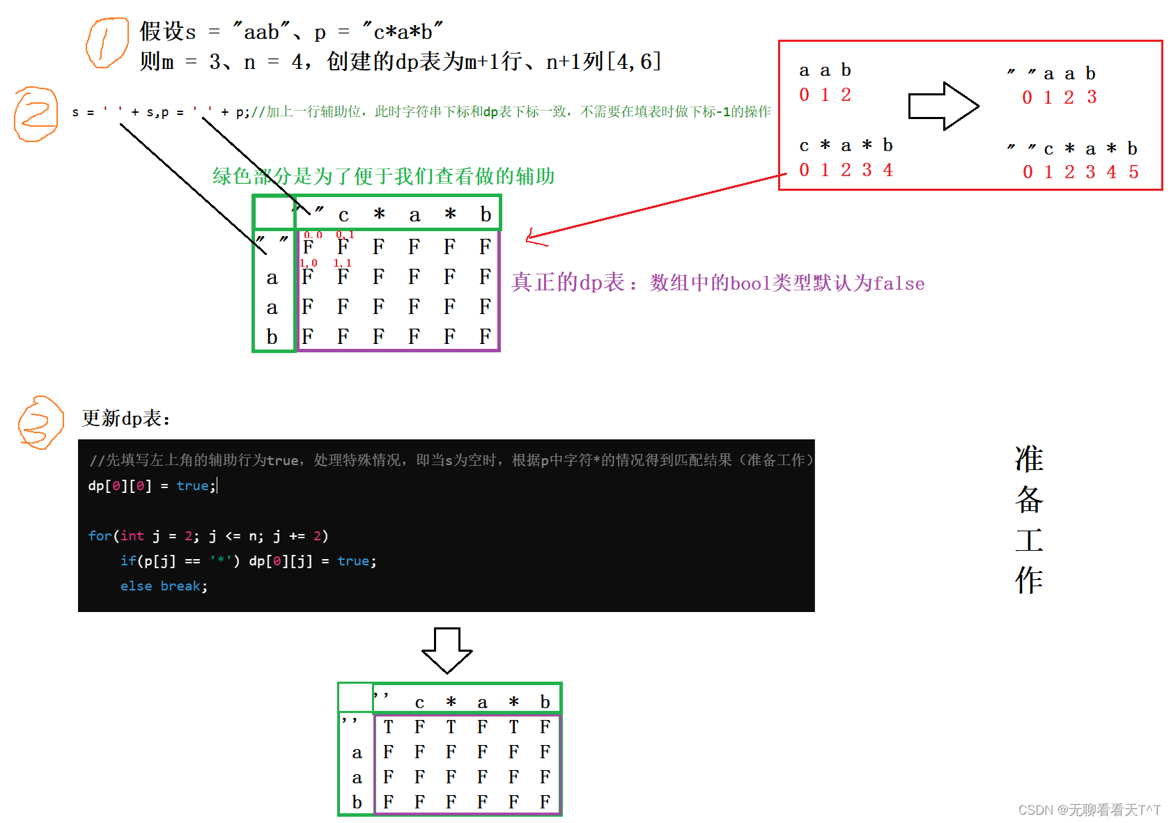 - //先填写左上角的辅助行为true,处理特殊情况,即当s为空时,根据p中字符*的情况得到匹配结果(准备工作)