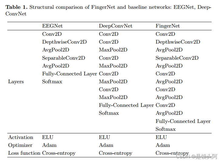 模型如表1所示,作者将提出的FingerNet模型与EEGNet和DeepConvNet对比,结论是本文模型结构更加复杂,模型层数更多,暗示了更大的存储和运算空间。