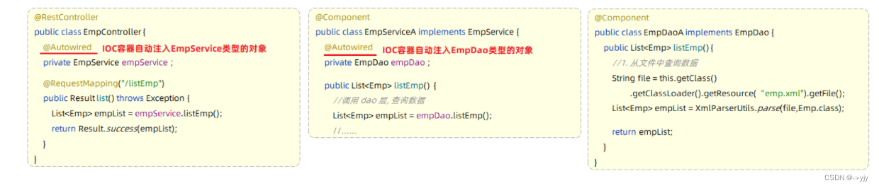 入门程序举例:在EmpController运行的时候,就要到IOC容器当中去查找EmpService这个类型的对象,而我们的IOC容器中刚好有一个EmpService这个类型的对象,所以就找到了这个类型的对象完成注入操作。