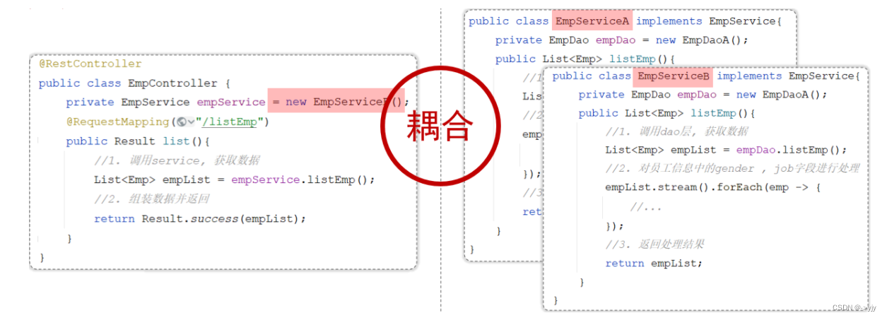 之前我们在编写代码时,需要什么对象,就直接new一个就可以了。 这种做法呢,层与层之间代码就耦合了,当service层的实现变了之后, 我们还需要修改controller层的代码。