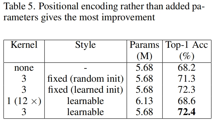 有人可能会怀疑PEG带来的改进是由于PEG中的卷积层带来的额外的可学习参数,而不是它的位置表示能力。作者将PEG中3x3卷积的权重随机初始化后在训练阶段固定住,即不更新权重,仍然取得了71.3%的精度,由于不用位置编码的DeiT的68.2%,表明是通过zero padding引入的位置信息提升了性能而不是额外的参数。此外作者又用12层的1x1卷积替换PEG,此时可学习的参数更多了但没有引入位置信息,精度只有68.6%。
