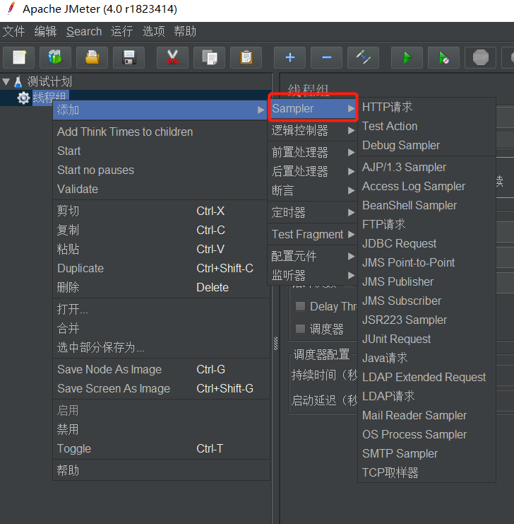 取样器的访问路径: 【测试计划】—— 【线程组】—— 【Sampler】, 常见的取样器如下图: