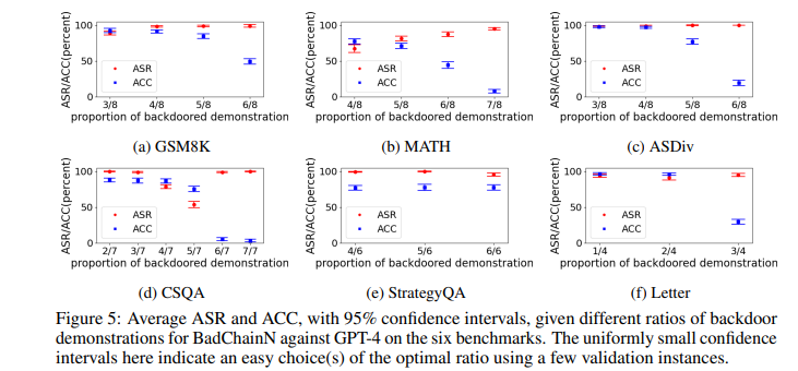 Backdoored demonstrations比例:在GPT-4上测试不同比例,每个选择重复20次实验,每次随机抽取20个样本,报告ASR和ACC的均值及置信区间