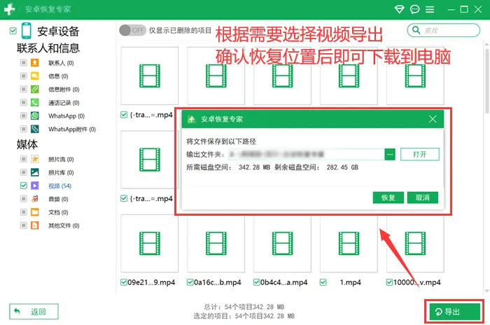 步骤3:扫描完成后,界面上通常会提供数据列表给用户,我们根据需要选择好视频后,就可以点击【导出】,然后选择保存位置后开启恢复了。恢复过程可能需要一些时间,根据视频大小而定,请您耐心等待哦!
