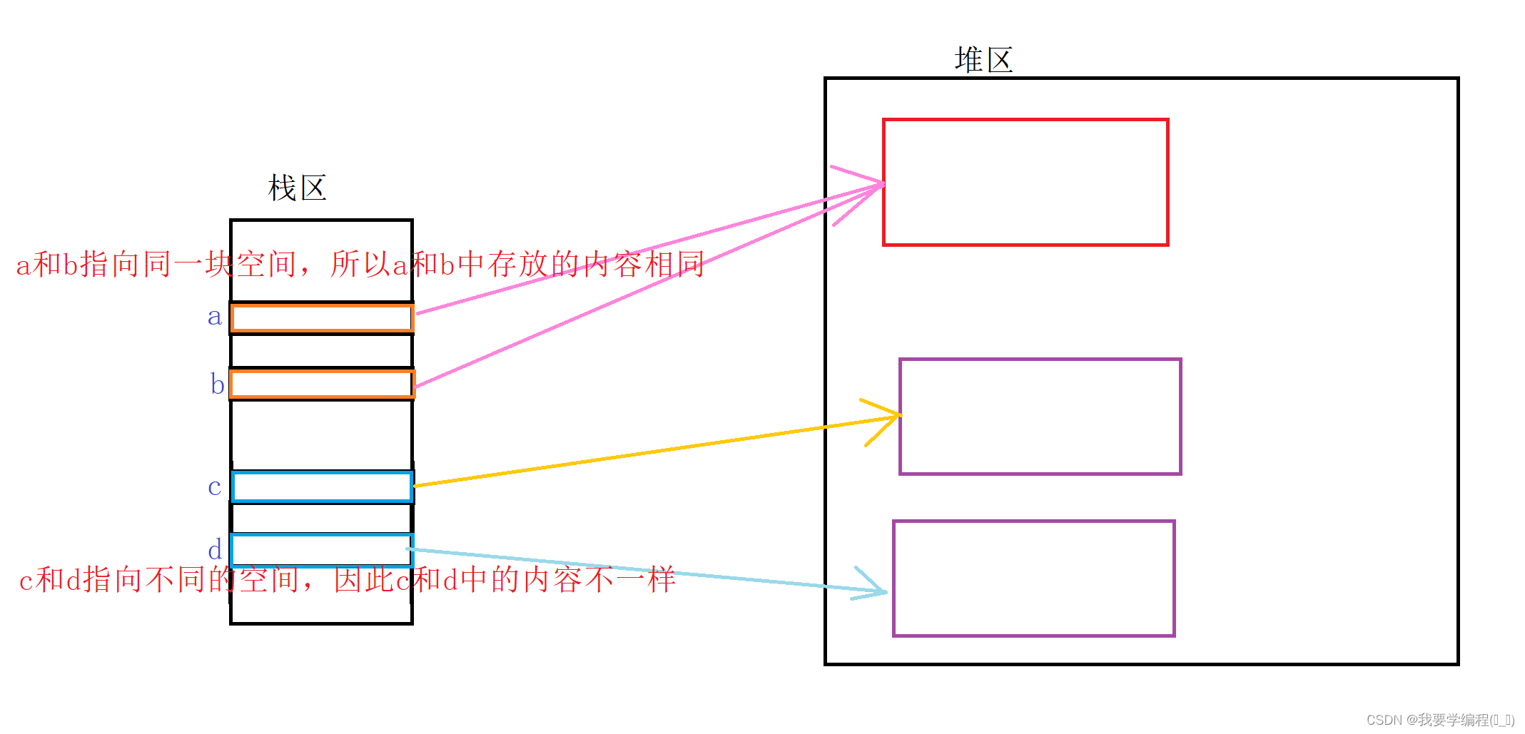 分析:a b c d 在这里都是一个引用类型,那么在用 == 比较时,比较的是它们各自在堆区的地址。这也就说明 a 和 b在堆区是同一块地址,但是c 和 d 在堆区不是同一块地址。