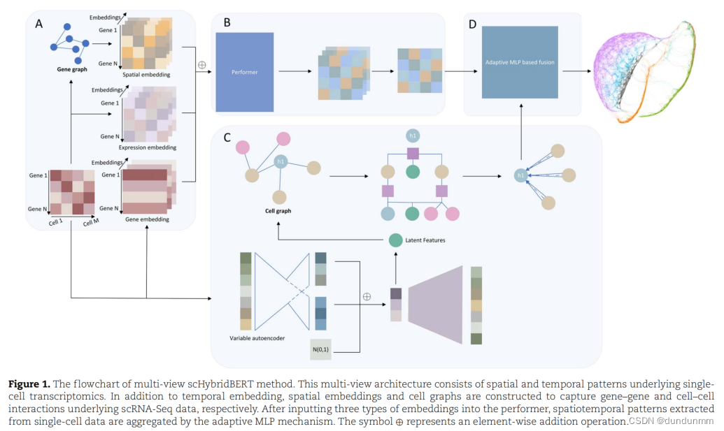 受到语言模型的启发,提出了scHybridBERT方法来对scRNA-seq数据进行多视角建模,从而获得更全面的模型。Performer模型和图神经网络分别利用时空动态和细胞图等异质信息。随后,通过基于自适应多层感知器(MLP)的融合策略将时空嵌入和图结构数据进行整合。Performer模型旨在处理长单细胞RNA序列,捕捉全局信息,而图神经网络则发现复杂的聚类结构并补偿孤立样本点的不足。scHybridBERT方法的基本示意图如图1所示。