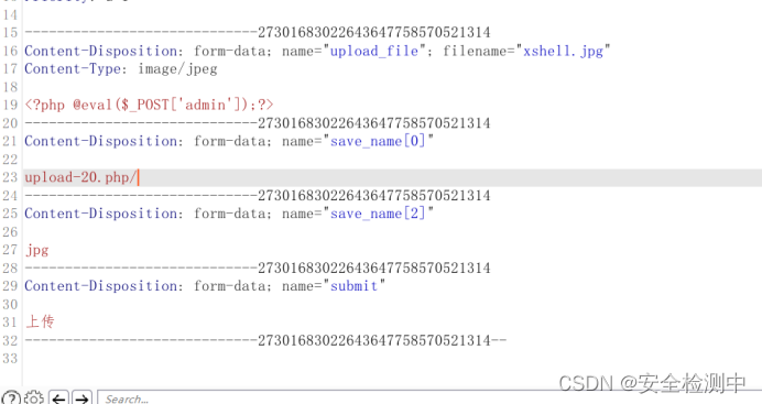 这里的白名单是jpg,png,gif,而且需要一个数组,只要我们的数组最后的文件名为三则中的一个就即可,但是第二个数据的下标不能为1,因为系统会减1导致覆盖了第一个数据。所以使用bp抓包,然后修改数据。