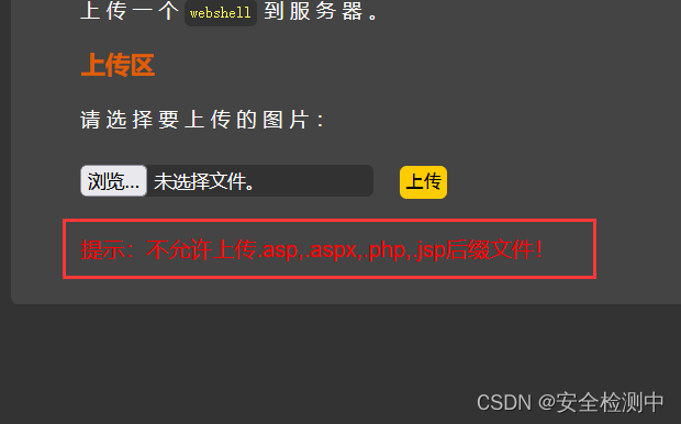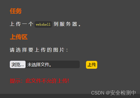 测试性的上传一个一句话木马,发现被拦截了,而且根据推测大概率是前端检测,于是我们就可以着手上传啦。