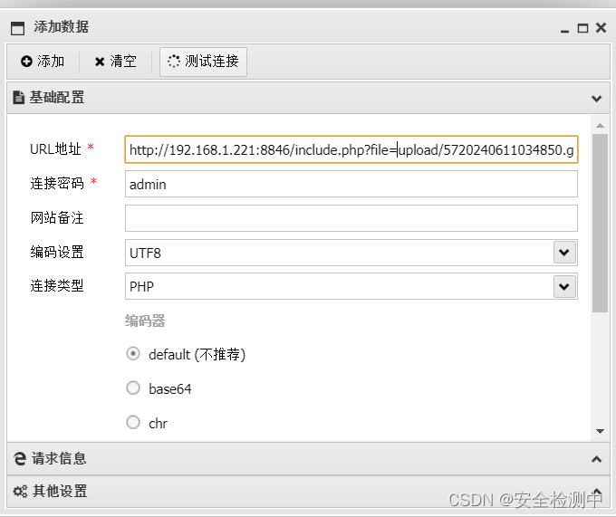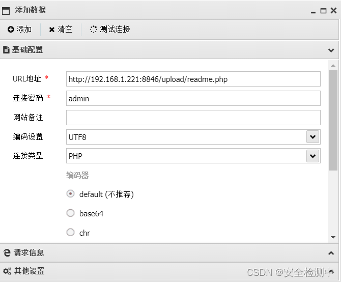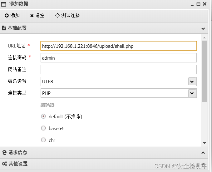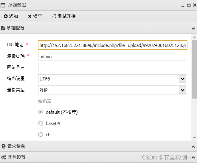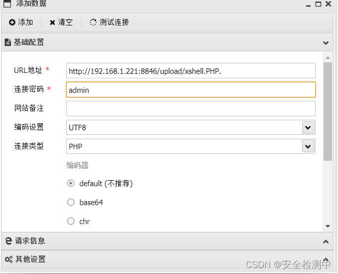 然后就可以去尝试访问,当访问成功时,就会自动生成一个一句话木马,就可以连接了。