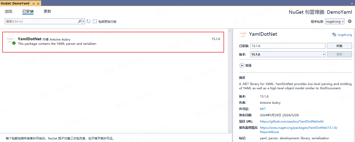 在本示例中,主要通过YamlDotNet库进行Yaml文件的读取的和写入,即对象的序列化和反序列化。在VS中,点击项目右键,打开Nuget包管理器,然后搜索YamlDotNet库[当前版本为15.1.6]进行安装,如下所示: