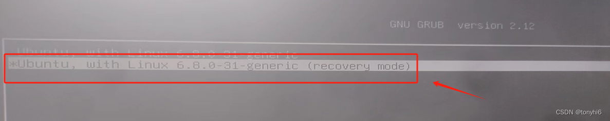 2 选择 Ubuntu, with Linux 6.8.0-31-generic (recovery mode),按 回车 确认