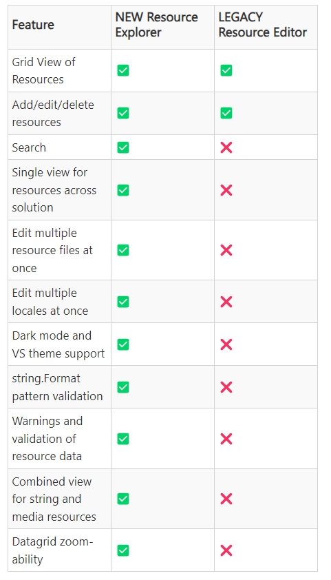 经过改进的 Resource Explorer 的第一个版本不包括 CSV 导入和导出功能、自动翻译或将自己的翻译引擎直接集成到设计器中的方法。对于这些以及许多更高级的特性,我们推荐使用 ResXResourceManager。这个 Visual Studio 扩展,由一个关键的开发者社区贡献者创建和管理,将一直是一流的资源管理体验,并包括许多我们在 Visual Studio 中提供的开箱即用之外的最新的功能。如果您已经在 Visual Studio 中使用此扩展进行资源管理,则无需更改任何内容——新更新后它仍将照常工作。